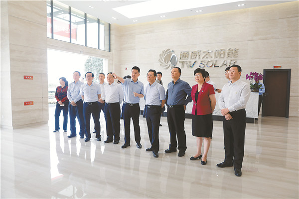 本報訊(記者 唐勝)9月12日、21日,全國政協副主席、民建中央辜勝阻常務副主席,全國政協副主席、全國工商聯高云龍主席,第十一屆、十二屆全國人大常委會陳昌智副委員長一行先后蒞臨通威調研,并參觀了通威太陽能公司智能化車間。四川省委常委、統戰部部長、省總工會主席田向利,民建中央副主席、四川省人大常委會副主任、民建四川省委主委陳文華,全國工商聯副主席、四川省政協副主席、省工商聯主席陳放,四川省政協副主席崔保華,民建四川省委副主委王元勇等領導陪同調研。通威集團董事局劉漢元主席熱情接待,并詳細介紹了通威新能源產業發展情況。通威集團副總裁黃其剛、通威太陽能董事長謝毅參與接待。