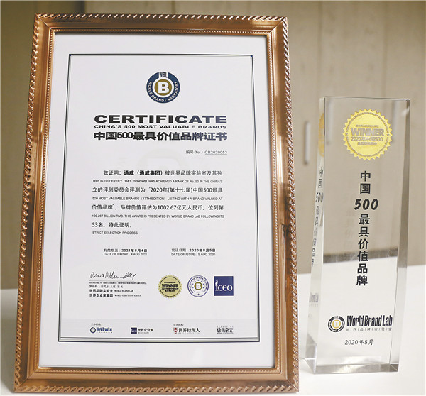 8月5日,由世界品牌實驗室主辦的2020年第十七屆世界品牌大會在北京舉行。通威品牌價值正式突破1000億元大關,達1002.67億元,創(chuàng)下歷史新高,成為全球水產(chǎn)和光伏兩大行業(yè)首個品牌價值破千億的企業(yè)!通威榮列2020年《中國500最具價值品牌》百強排行榜,位列53位。