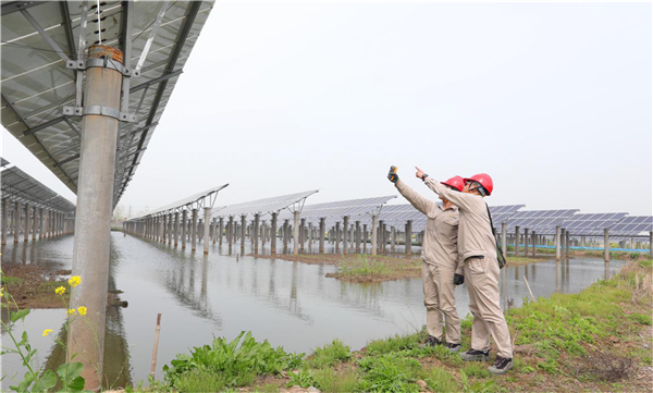 通威龍袍“漁光一體”基地運維人員對光伏板進行測溫