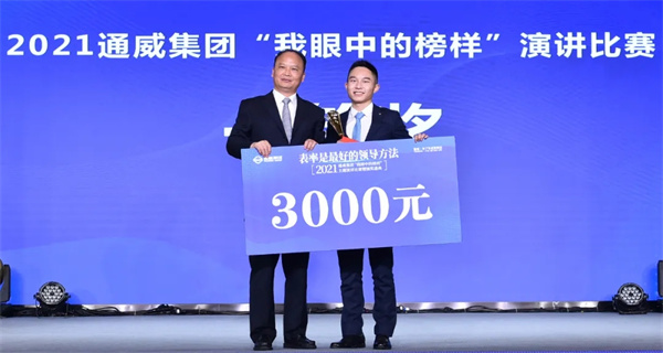 劉漢元主席為2021通威集團“我眼中的榜樣”演講比賽一等獎獲得者頒獎