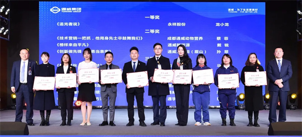 通威股份總裁郭異忠,集團企業文化專項小組執行組長、集團副總裁黃其剛為“表率是最好的領導方法”主題征文獲獎員工頒獎