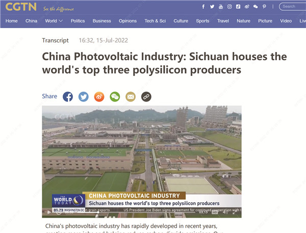 7月15日,CGTN中國國際電視臺在《The World Today》欄目播出了一則以“China Photovoltaic Industry: Sichuan houses the world's top three polysilicon producers”(中國光伏產業:四川擁有世界前三大多晶硅生產商)為題的報道,向全世界推介永祥股份。