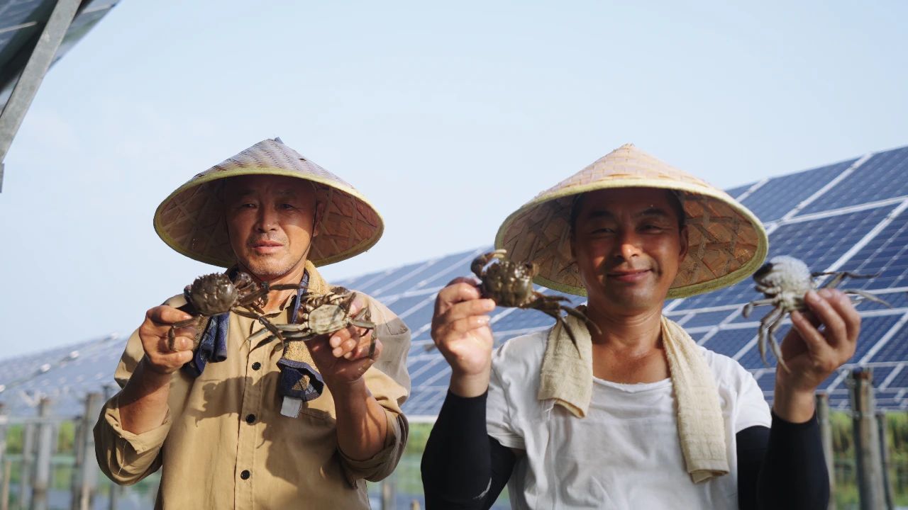龍袍基地建成前是灘涂地,雜草叢生,建成“漁光一體”基地后,上可發電、下可養蟹,做到了空間上的立體復用,節省了土地,還能輸出清潔能源電。“漁光一體”創造性地把光伏和農業這兩個會占用大量土地資源的產業相結合,一舉多得。