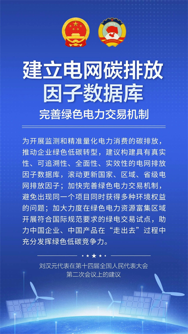 “建議加大力度在綠色電力資源富集區域開展符合國際規范要求的綠電交易試點,充分發揮綠色電力在降低企業或產品碳排放方面的作用,助力中國企業、中國產品在‘走出去’過程中充分發揮綠色低碳競爭力?!眲h元代表說。