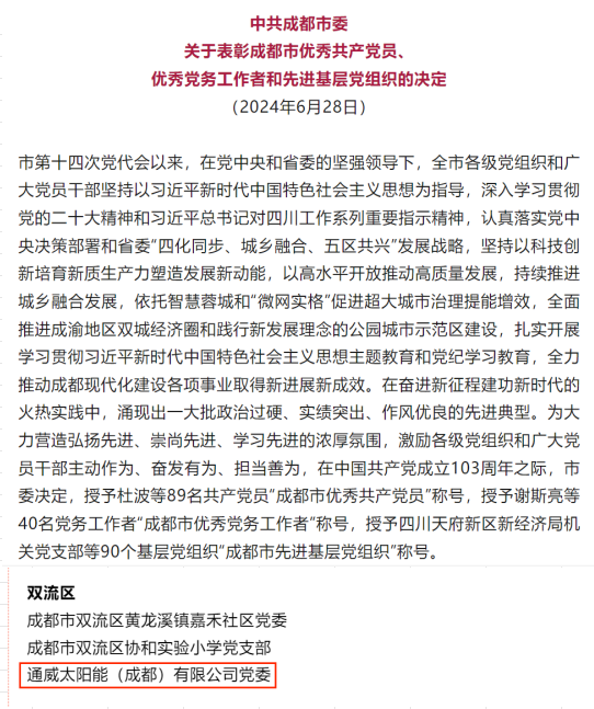 7月1日,中共成都市委、淮州新城發(fā)布了關(guān)于表彰“兩優(yōu)一先”的決定,通合新能源(金堂)有限公司黨支部書記羅曉云榮獲2024年“成都市優(yōu)秀黨務(wù)工作者”稱號(hào),通合新能源黨支部榮獲“淮州新城先進(jìn)基層黨組織”,黨員王沙、陳日強(qiáng)同志分別榮獲“淮州新城優(yōu)秀共產(chǎn)黨員”“淮州新城優(yōu)秀黨務(wù)工作者”稱號(hào)。