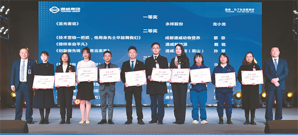 通威股份總裁郭異忠,集團企業文化專項工作小組執行組長、集團副總裁黃其剛為“表率是最好的領導方法”主題征文活動獲獎員工頒獎