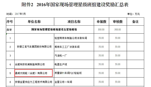 通威太陽能(合肥)有限公司喜獲2016年國家現場管理星級班組建設獎勵