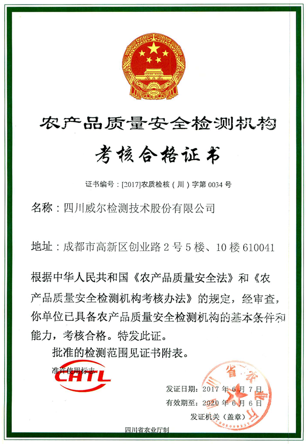 近日,四川威爾檢測(cè)喜獲CATL證書(農(nóng)產(chǎn)品質(zhì)量安全檢測(cè)機(jī)構(gòu)考核合格證書),成為四川省首家獲此證書的非國(guó)有第三方檢測(cè)機(jī)構(gòu)。