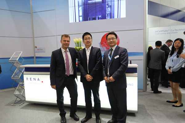 謝毅董事長(zhǎng)到訪RENA展臺(tái)并與RENA亞太區(qū)總裁Daniel Rieser(左一)、中國(guó)區(qū)總經(jīng)理陳衛(wèi)東(左三)合影留念