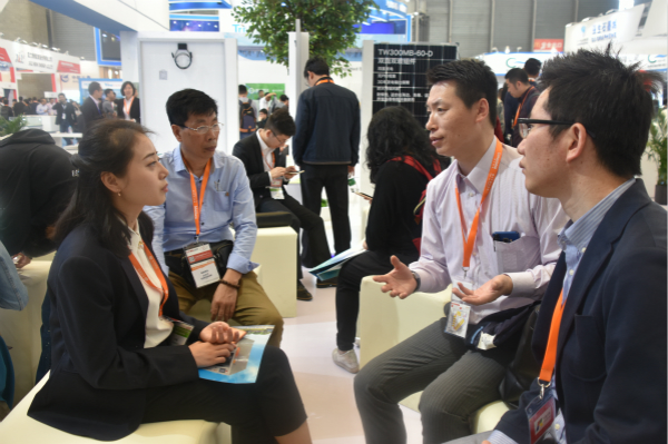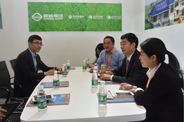通威集團禚玉嬌總裁與永祥股份財務總監周斌在通威展臺交流