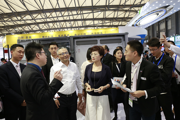 禚總一行領(lǐng)導(dǎo)首先來(lái)到通威展臺(tái),聽(tīng)取布展情況匯報(bào),隨后參觀了華為公司展臺(tái),詳細(xì)了解了華為FusionSolar智能光伏解決方案5.0的相關(guān)情況。在亞瑪頓、SMA Solar、南京日托光伏科技有限公司展臺(tái),禚總就雙玻組件、逆變器、太陽(yáng)能電池片等方面與參展企業(yè)進(jìn)行了交流洽談。當(dāng)天,禚總還受邀出席了陽(yáng)光電源2017新品發(fā)布會(huì),并作為嘉賓上臺(tái)共同啟動(dòng)新品發(fā)布會(huì)裝置。