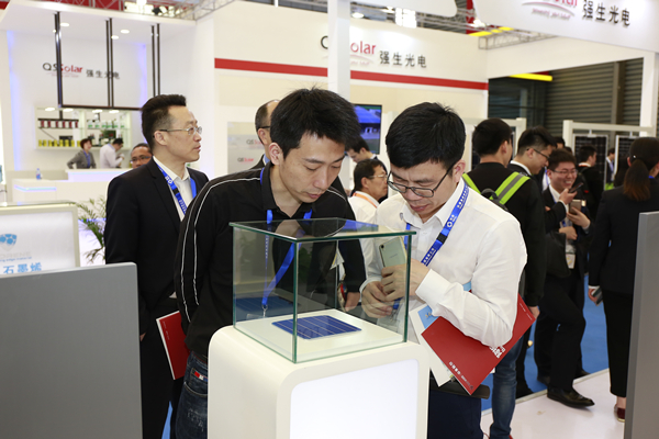 參展商在通威集團(tuán)展臺(tái)查看太陽(yáng)能電池片