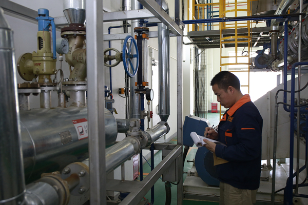 工作人員在膨化機(jī)前檢查數(shù)據(jù)