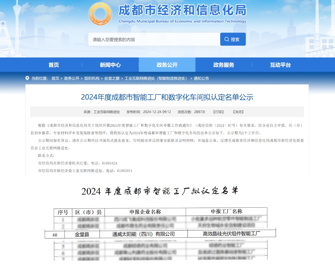 通威太陽能(四川)有限公司獲評2024年度成都市智能工廠