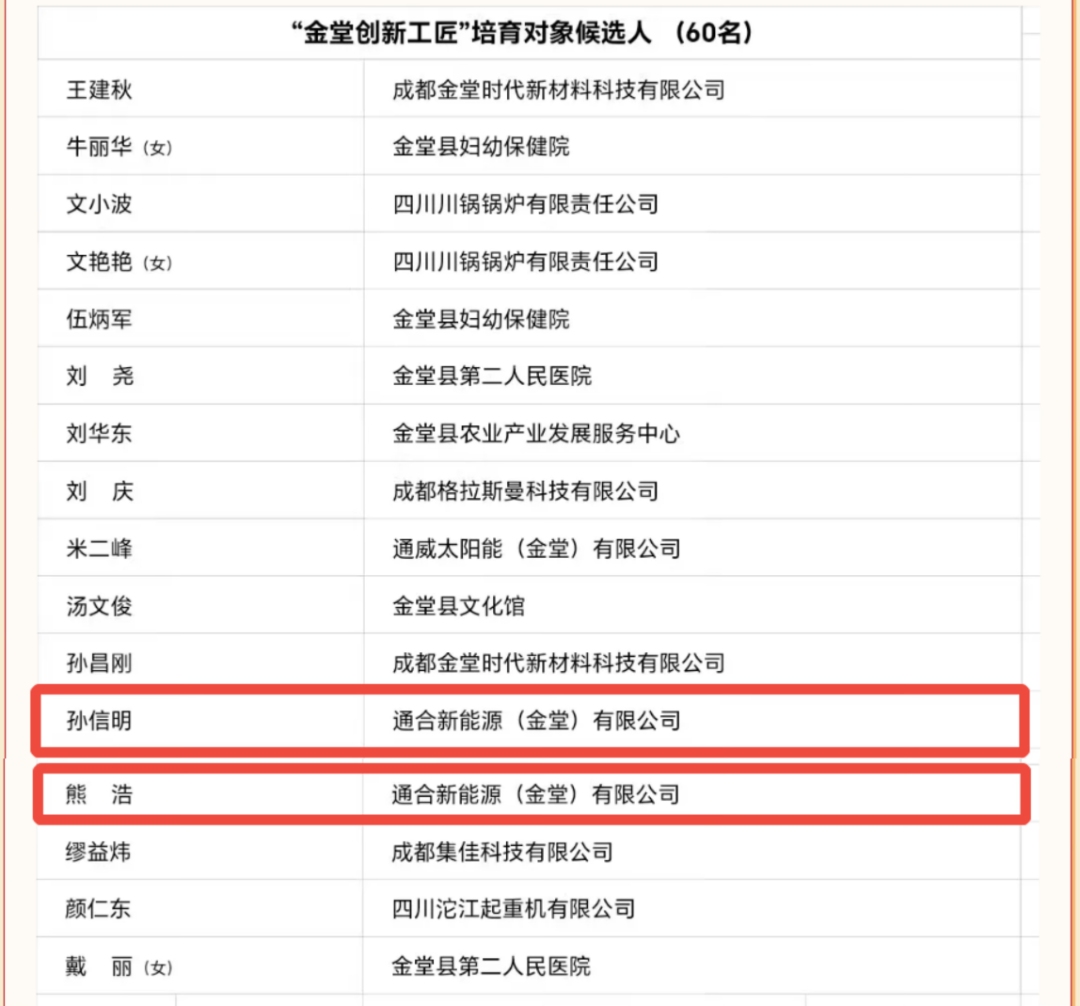 通合新能源(金堂)有限公司兩名員工成功入選“金堂創新工匠”培育對象
