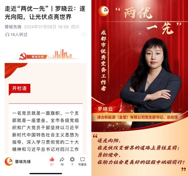 通合新能源(金堂)有限公司黨支部書記羅曉云入選蓉城先鋒“走近兩優一先”專題人物報道