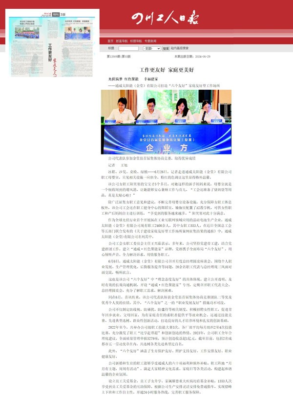 《四川工人日報》聚焦:通威太陽能(金堂)有限公司引領(lǐng)家庭友好型工作場所新風尚
