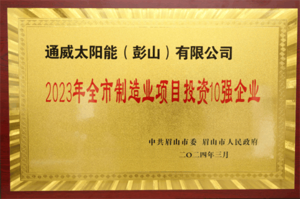 通威太陽能(彭山)有限公司榮獲“2023眉山市制造業項目投資10強企業”榮譽