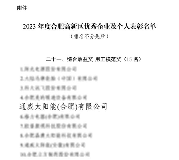 通威太陽能(合肥)有限公司榮獲 合肥高新區2023年度“綜合效益獎-用工模范獎”