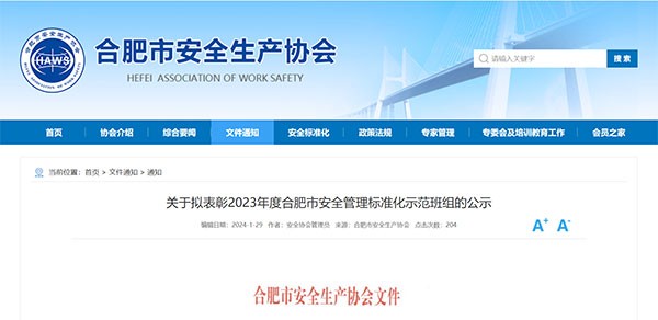 通威太陽(yáng)能安徽公司榮獲“合肥市安全管理標(biāo)準(zhǔn)化示范班組”榮譽(yù)稱號(hào)
