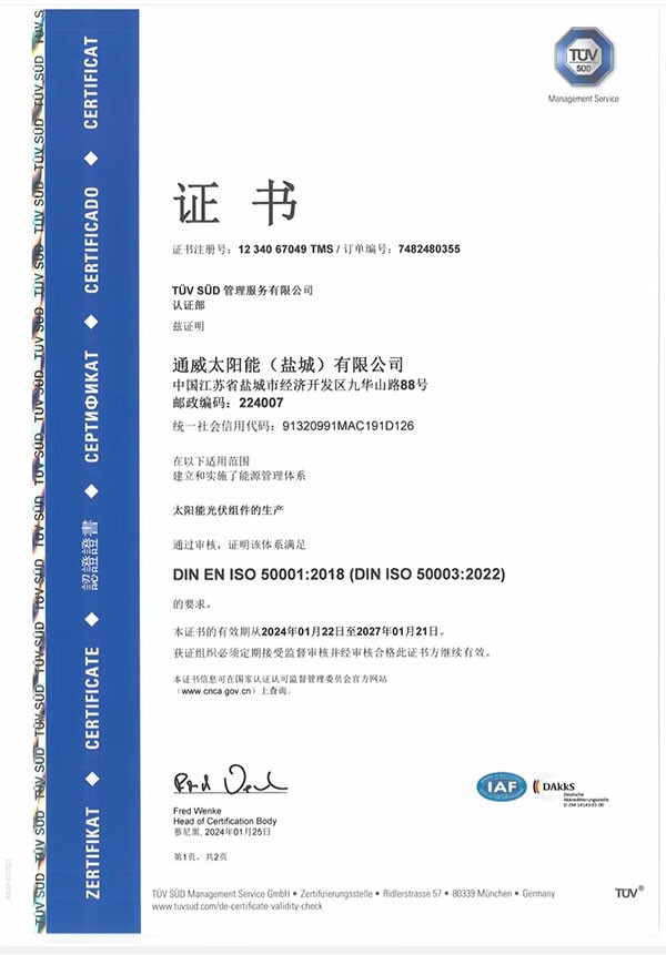 通威太陽能(鹽城)有限公司 榮獲TÜV南德ISO 50001:2018認證證書