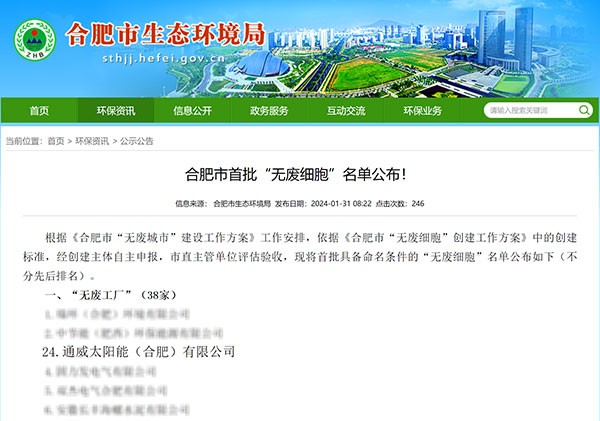 通威太陽能(合肥)有限公司 榮獲合肥市首批“無廢工廠”稱號