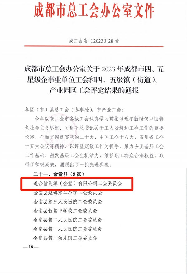 通合新能源工會獲評2023年成都市四星級工會榮譽稱號