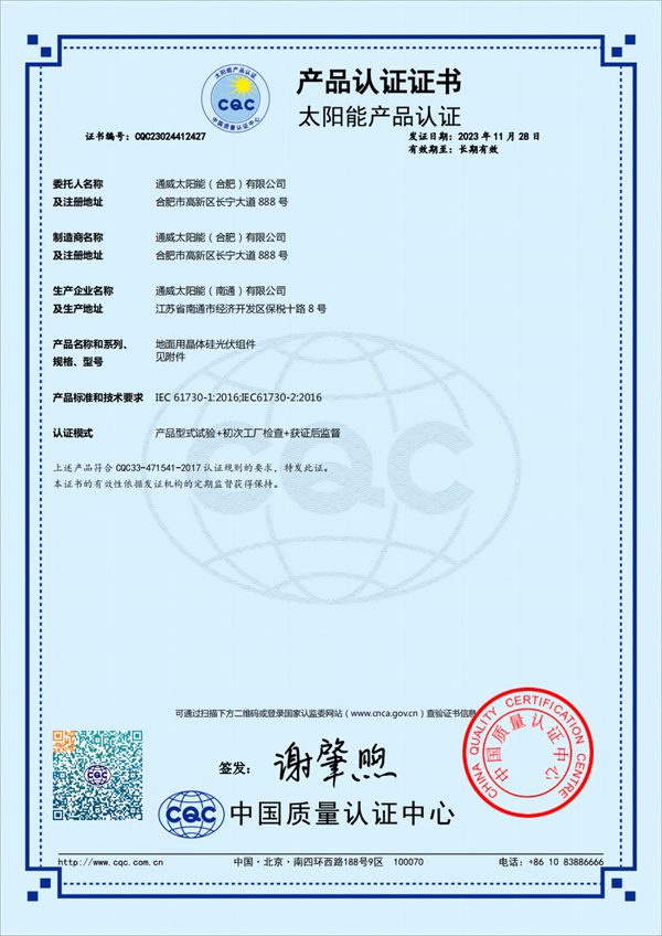 通威太陽能(組件)南通基地榮獲中國質量認證中心(CQC)產品認證證書