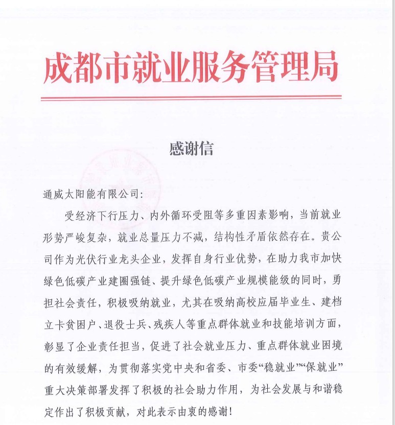 成都市就業(yè)局發(fā)來(lái)感謝信,感謝通威太陽(yáng)能為成都市“穩(wěn)就業(yè)”“保就業(yè)”作出的突出貢獻(xiàn)
