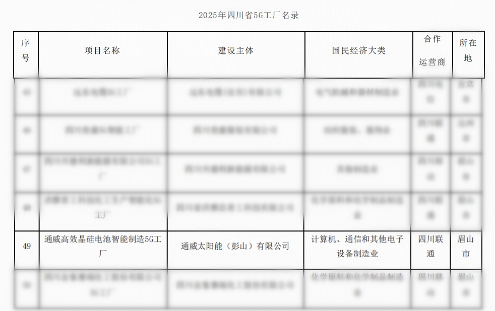 通威太陽能(彭山)有限公司入選“2025年四川省5G工廠名錄”