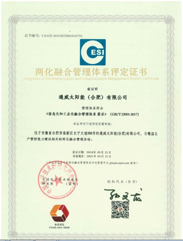 通威太陽能合肥公司順利通過“2018年國家兩化融合管理體系貫標”