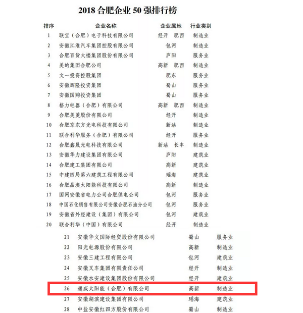 通威太陽能(合肥)有限公司連續多年入列合肥企業50強、合肥制造業企業30強榮譽榜單