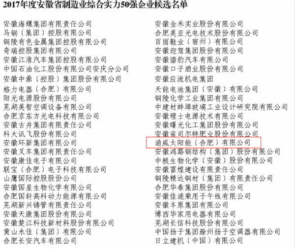 通威太陽能榮列安徽省制造業兩項榮譽公示榜單