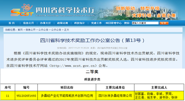 永祥多晶硅榮獲四川省科技進(jìn)步二等獎