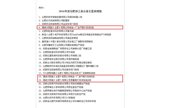 通威太陽能(合肥)有限公司獲評“2016年度合肥市工業企業五星級班組”