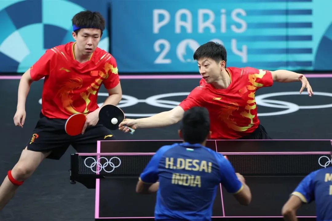 當地時間8月6日,中國組合馬龍(上右)/王楚欽在巴黎奧運會乒乓球男團16強賽比賽中。新華社記者 劉續攝