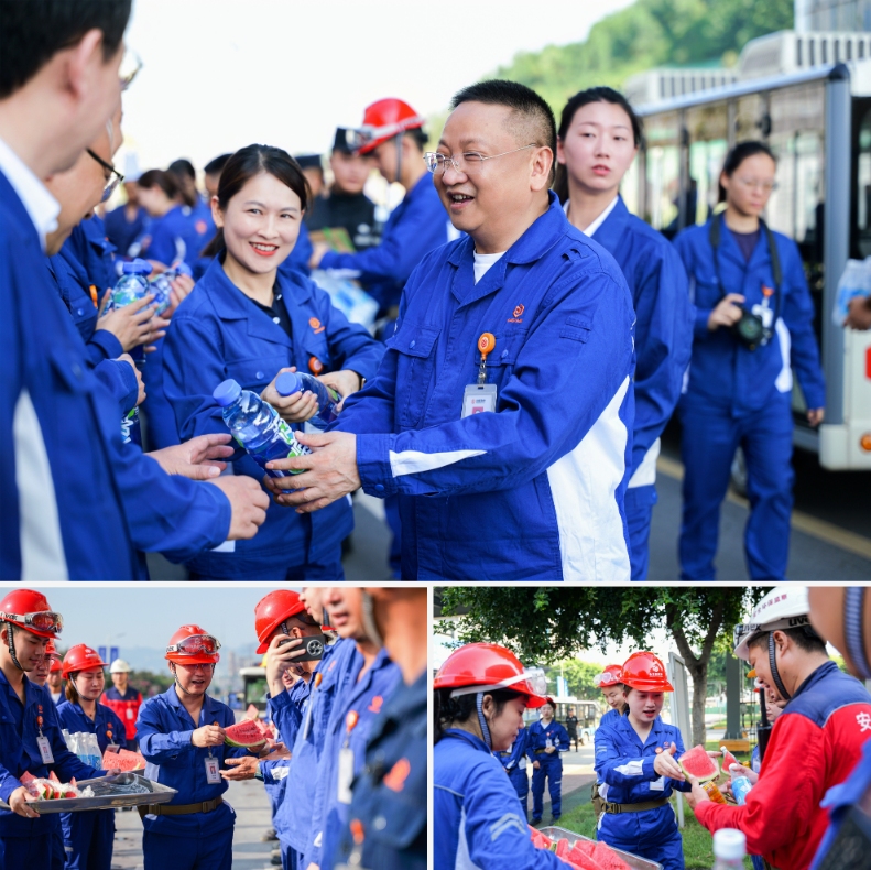 現場,李總和股份領導們親自將一瓶瓶清涼飲品和一塊塊甘甜多汁的西瓜遞到員工手中,并親切地詢問大家的工作與生活情況,反復叮囑:“天氣熱,大家一定要注意身體,多喝水,防止中暑。”這簡單卻溫暖的話語,如同夏日里的一縷清風,瞬間拂去了員工們臉上的疲憊與汗水。“感謝領導們的關心!”員工們的笑容是對這份關懷最好的回應。李總對所有在炎炎夏日依舊堅守在生產和工程建設前線的所有永祥家人們表示衷心的感謝,并叮囑大家一定要時刻緊繃安全弦,所有的工作都要以保障安全為前提,要注意安全生產和工程管理,做好高溫作業保護及消暑降溫工作。現場工作人員紛紛表示,一定會堅守崗位,履職盡責,用心工作,用智慧工作,用只爭朝夕的精神工作,為公司發展添磚加瓦。