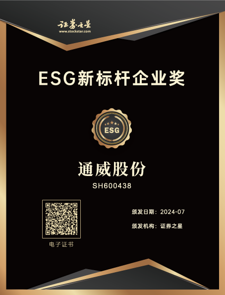 為表彰經(jīng)濟(jì)效能與社會責(zé)任并重的綠色企業(yè),為中國ESG發(fā)展提供示范性樣本,助力上市公司引領(lǐng)綠色發(fā)展,履行社會責(zé)任,提升公司治理水平,助推經(jīng)濟(jì)可持續(xù)、高質(zhì)量發(fā)展,本屆ESG研討會證券之星聯(lián)合華證指數(shù)發(fā)布了2024年《ESG投資價值TOP100榜單》,并頒發(fā)證券之星ESG新標(biāo)桿企業(yè)獎。通威股份入選ESG投資價值TOP100榜單并榮獲證券之星ESG新標(biāo)桿企業(yè)獎。