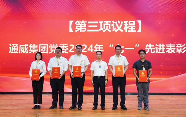 會(huì)上,全體黨員首先莊重重溫入黨誓詞,并觀看“七一”建黨宣傳片,致敬中國共產(chǎn)黨百年征程。隨后,主持人宣讀通威集團(tuán)黨委2024年“七一”優(yōu)秀黨員名單,姚騫書記現(xiàn)場(chǎng)為他們頒獎(jiǎng)并合影留念。他勉勵(lì)黨員同志們要做好表率作用,遇到困難迎難而上,奮勇爭(zhēng)先;鼓勵(lì)骨干流動(dòng)黨員積極將組織關(guān)系轉(zhuǎn)入公司,壯大黨員隊(duì)伍,為明年升級(jí)黨委做好人才儲(chǔ)備和建設(shè)準(zhǔn)備。