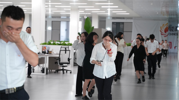 本次疏散逃生演練分別以有預警及無預警兩種形式開展,伴隨著火災警報聲、消防廣播聲,疏散逃生演練正式開始,各基地職工在應急小組工作人員的組織引導下緊急疏散,用手捂住口鼻、彎腰低姿,沿樓梯有序撤離至安全區域。