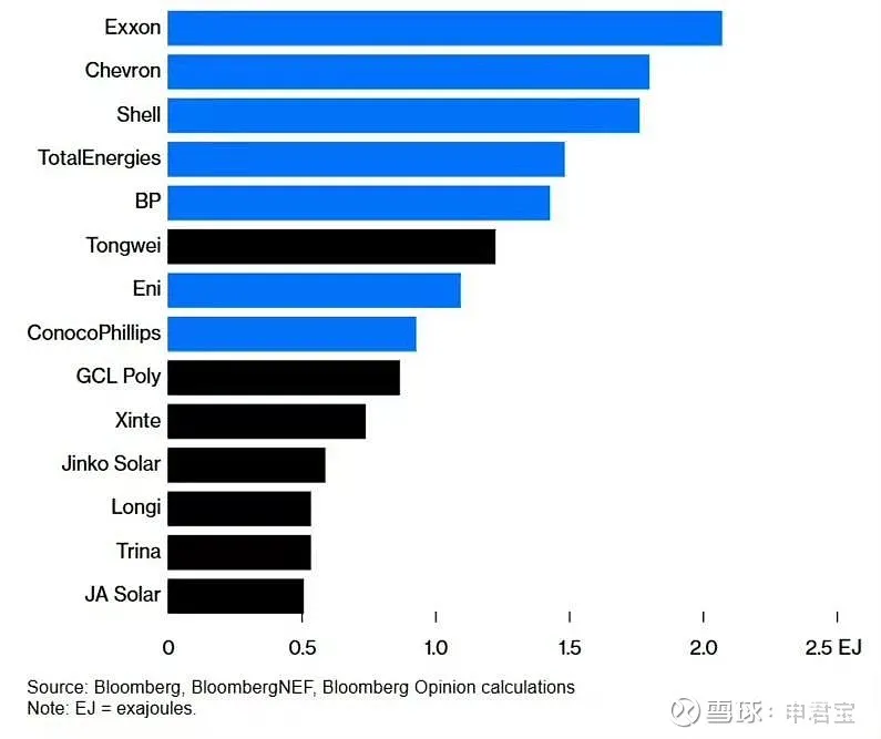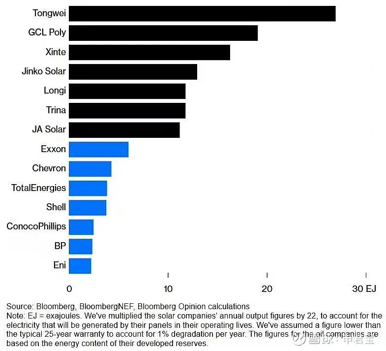 看起來石油公司仍然領先,但是通威等公司一年生產的能源,已經能和大型石油公司相比了。但是這種比較不公平,因為石油公司挖出來的油不可再生,儲量挖完了就沒了。太陽能公司的“儲量”,可以根據其產能乘以7.5進行估算。這樣就得到了下圖: