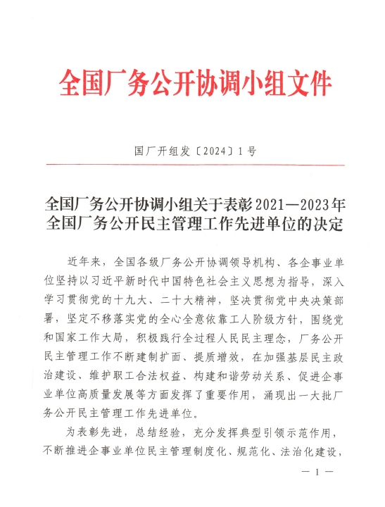 眉山公司獲評“2021—2023年全國廠務公開民主管理先進單位”