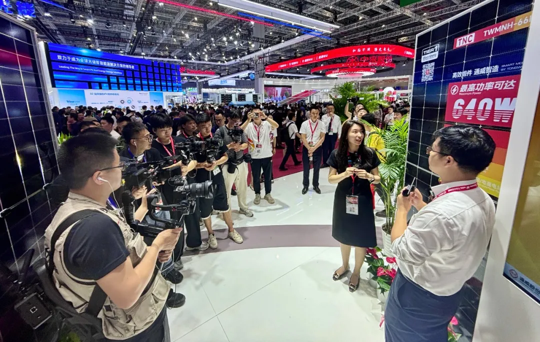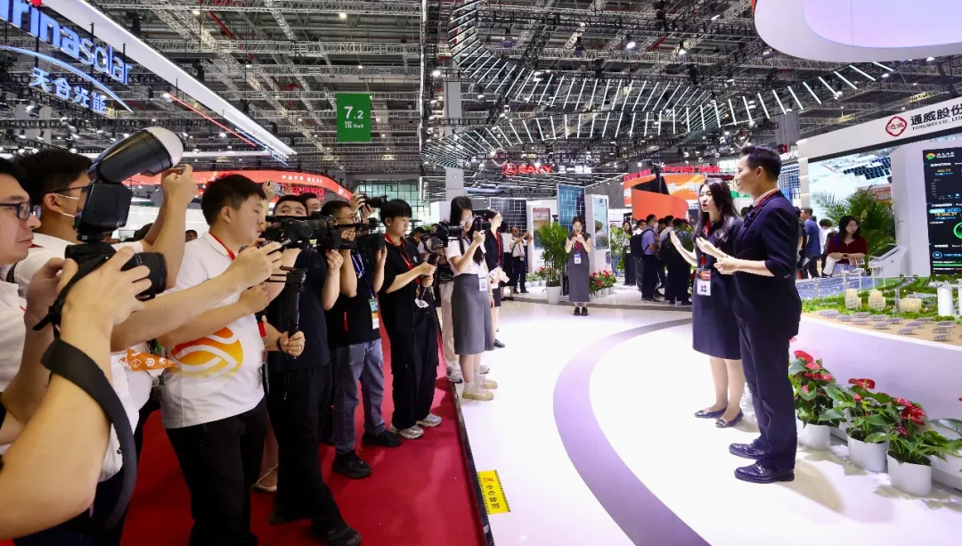 在通威展臺上的通威光伏產(chǎn)業(yè)鏈產(chǎn)品吸引了眾多媒體探展“打卡”。華夏雙碳能源研究院、世紀(jì)新能源網(wǎng)、光伏們、華夏能源網(wǎng)、北極星太陽能光伏網(wǎng)、能見、中國能源產(chǎn)業(yè)發(fā)展網(wǎng)等10家媒體,現(xiàn)場采訪通威光伏產(chǎn)業(yè)鏈上中下游相關(guān)負(fù)責(zé)人,全面了解通威高效光伏產(chǎn)品和領(lǐng)先技術(shù)實(shí)力。
