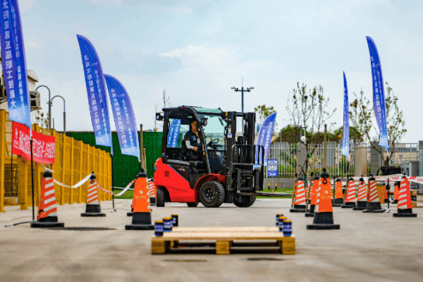 叉車技能競賽現場,選手熟練駕駛叉車進行繞樁考驗