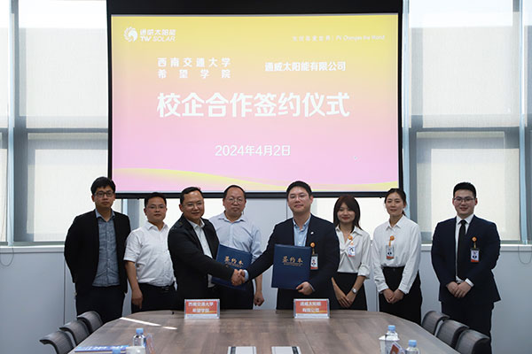 簽約儀式上,通合新能源人力資源部負(fù)責(zé)人代表公司對(duì)校方的到訪表示熱烈歡迎,并介紹了公司的基本情況和人才培養(yǎng)策略,并表示,通威太陽(yáng)能作為全球領(lǐng)先的晶硅太陽(yáng)能電池企業(yè),深知人才是企業(yè)發(fā)展的核心動(dòng)力,感謝西南交通大學(xué)希望學(xué)院為企業(yè)提供寶貴的人才資源。王書(shū)記則介紹了學(xué)院的學(xué)科優(yōu)勢(shì)、專業(yè)建設(shè)成果及畢業(yè)生就業(yè)情況,并表示期待與通威太陽(yáng)能在實(shí)習(xí)實(shí)訓(xùn)、訂單式人才培養(yǎng)、就業(yè)推薦等方面展開(kāi)深度合作。