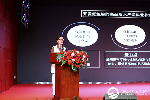 成都美溢德產品總監肖偉偉作《低魚粉或低蛋白的高品質水產飼料營養方案的研發成果》主題演講時提出,開發低魚粉或低蛋白的高品質水產飼料能助力實現更低的斤魚飼料成本,從而促進水產業的可持續發展。美溢德研究了兩類方案實現中的技術難點,通過開發新的功能蛋白產品及應用方案,成功研發了低魚粉或低蛋白的高品質水產飼料營養方案。