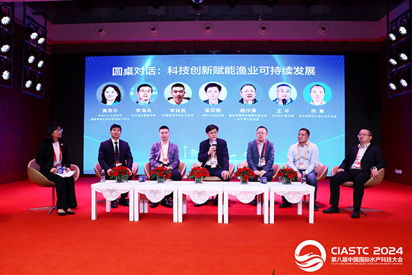 圓桌對話環節,黃燕華院長擔任主持。佛照科技總經理梁觀穩、納鑫能源常務副總經理李祥民、科潤德運營副總裁李海兵、嘉吉微營養與健康科技業務水產事業部總監駱作勇、中正水產副總裁王平、漁光物聯現代漁業技術總監陳章六位嘉賓,圍繞“科技創新賦能漁業可持續發展”這一主題,探討行業前沿技術,分享技術發展成果。