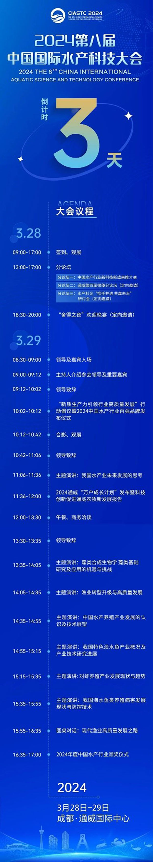 3月28-29日2024第八屆中國國際水產科技大會將在成都通威國際中心隆重舉行大會期間來自中央、省、市政府部門及行業(yè)協(xié)會重要領導、行業(yè)專家、領袖企業(yè)家及企業(yè)精英將齊聚一堂探討水產行業(yè)可持續(xù)發(fā)展道路讓世界聽到中國水產聲音賦能全球水產行業(yè)高質量發(fā)展