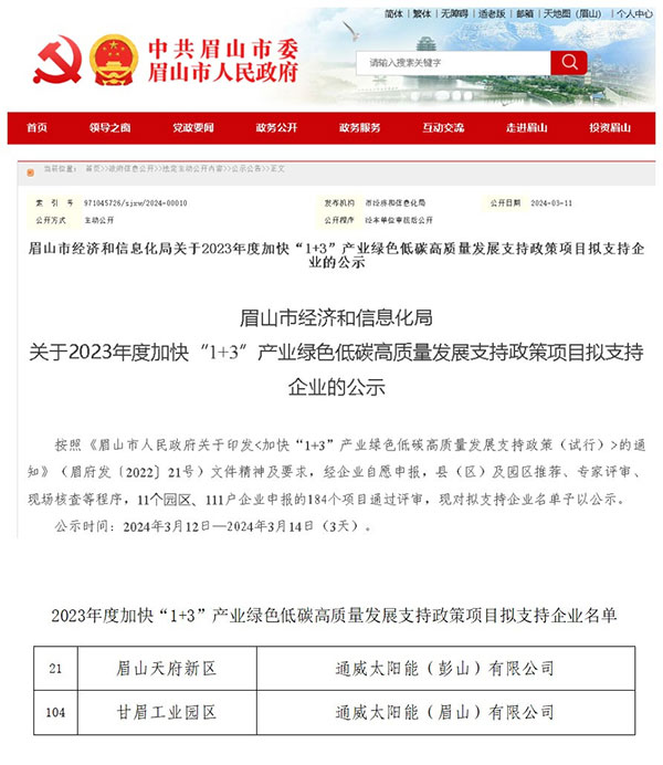 3月12日,中共眉山市委市政府官方網(wǎng)站正式公示了《2023年度加快“1+3”產(chǎn)業(yè)綠色低碳高質(zhì)量發(fā)展支持政策項(xiàng)目擬支持企業(yè)名單》,通威太陽能眉山基地、彭山基地經(jīng)自主申報(bào),通過縣(區(qū))及園區(qū)推薦、專家評審等層層審核,成功入列其中。