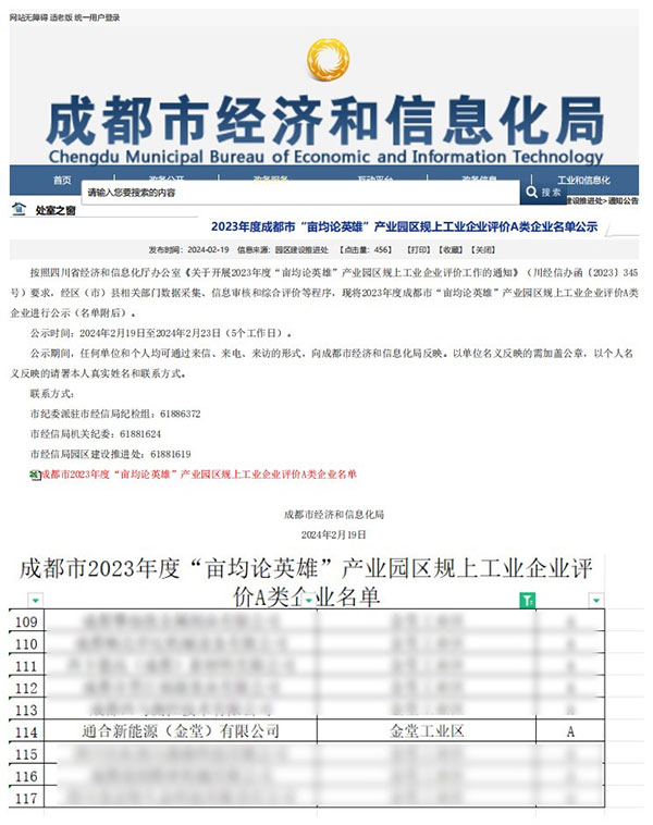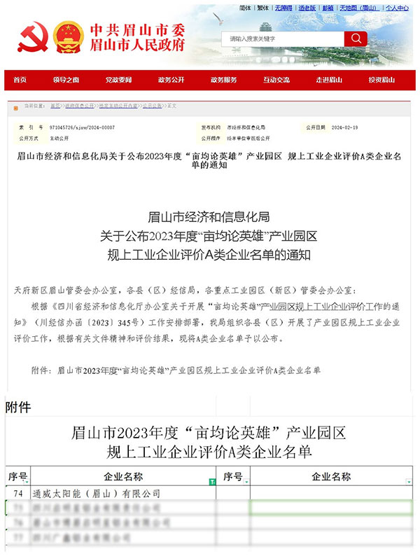 2月23日,按照四川省經(jīng)濟(jì)和信息化廳辦公室《關(guān)于開展2023年度“畝均論英雄”產(chǎn)業(yè)園區(qū)規(guī)上工業(yè)企業(yè)評價工作的通知》(川經(jīng)信辦函〔2023〕345號)要求,經(jīng)區(qū)(市)縣相關(guān)部門對數(shù)據(jù)采集、信息審核和綜合評價等程序,成都市經(jīng)濟(jì)和信息化局公示了2023年度成都市“畝均論英雄”產(chǎn)業(yè)園區(qū)規(guī)上工業(yè)企業(yè)評價A類企業(yè)名單、中共眉山市委市政府官方網(wǎng)站正式公布了《眉山市2023年度“畝均論英雄”產(chǎn)業(yè)園區(qū)規(guī)上工業(yè)企業(yè)評價A類企業(yè)名單》,通威太陽能雙流基地、通合項目、眉山基地分別榮列其中。